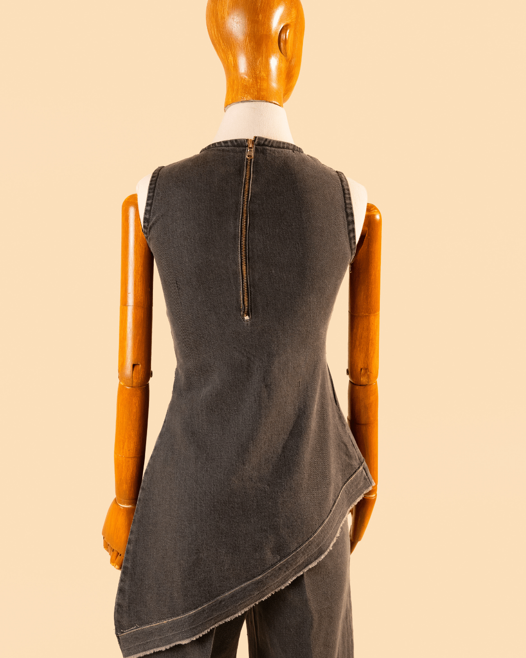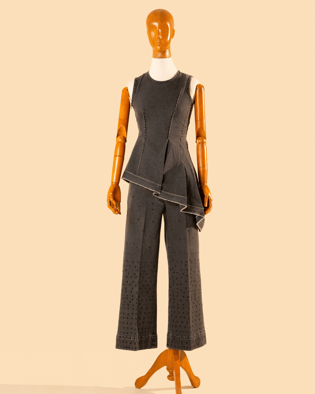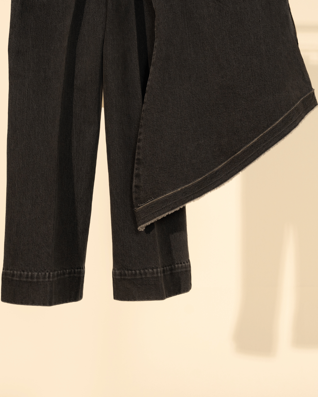 These wide-leg trousers complement the top with their relaxed yet refined silhouette. Crafted in the same deep charcoal denim, the design features delicate rhinestone perforation work that adds subtle sparkle and depth. Structured yet fluid, the trousers bring a sense of effortless glamour to the coordinated set.