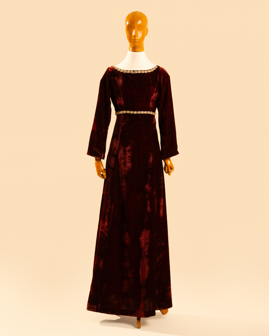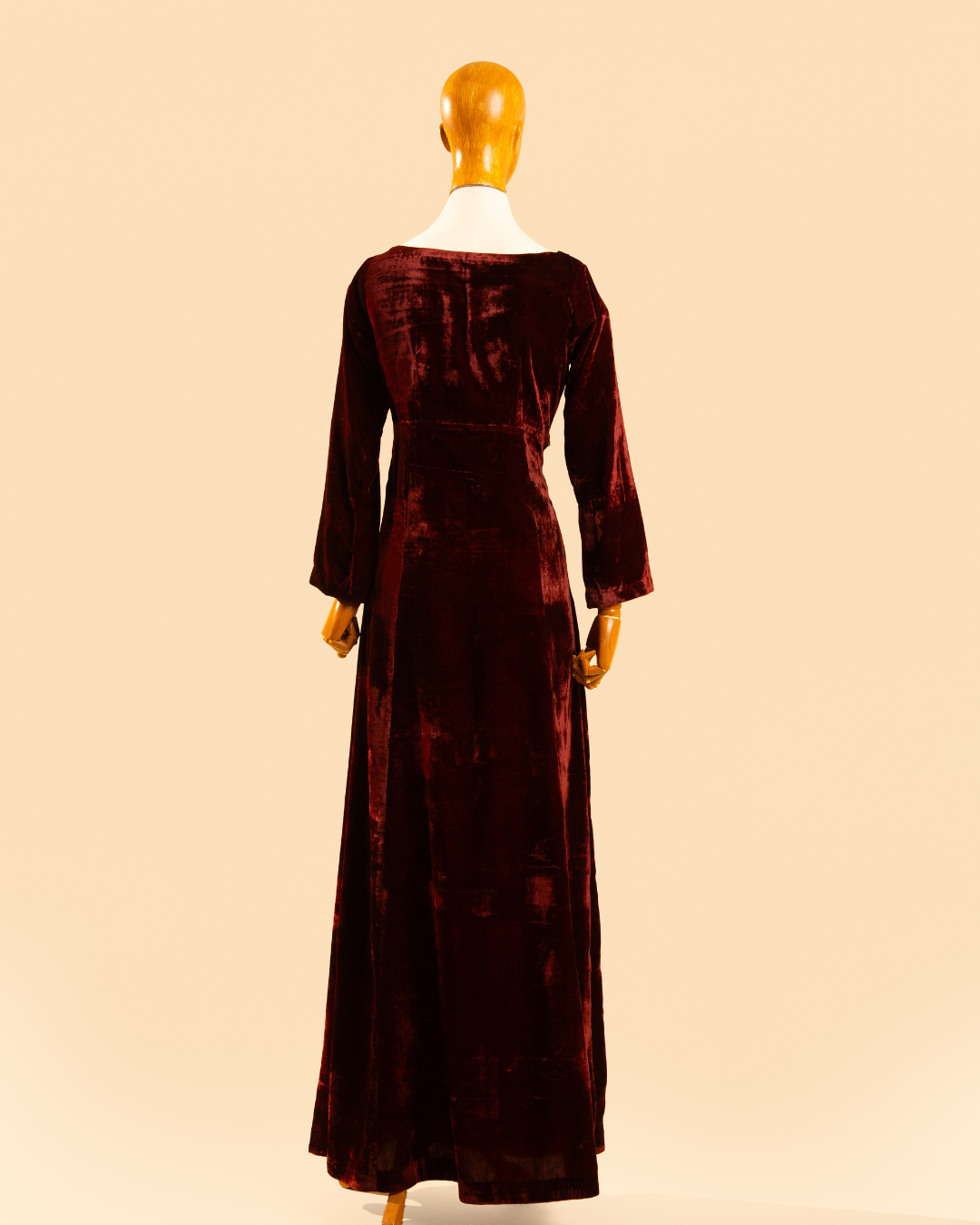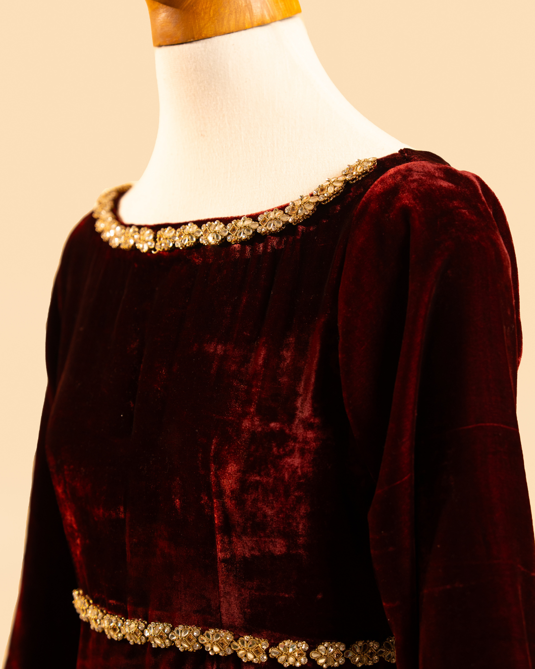 Crafted from deep maroon velvet, crimson hour blends classic glamour with minimal detail. The soft sheen and kundan crystal-trimmed neckline elevate its timeless appeal. Perfect for evening wear with effortless sophistication.